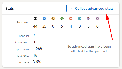 Please note that advanced stats can only be collected for personal profiles and groups, not for company pages. Also, new stats are available only for posts up to 1 year old.