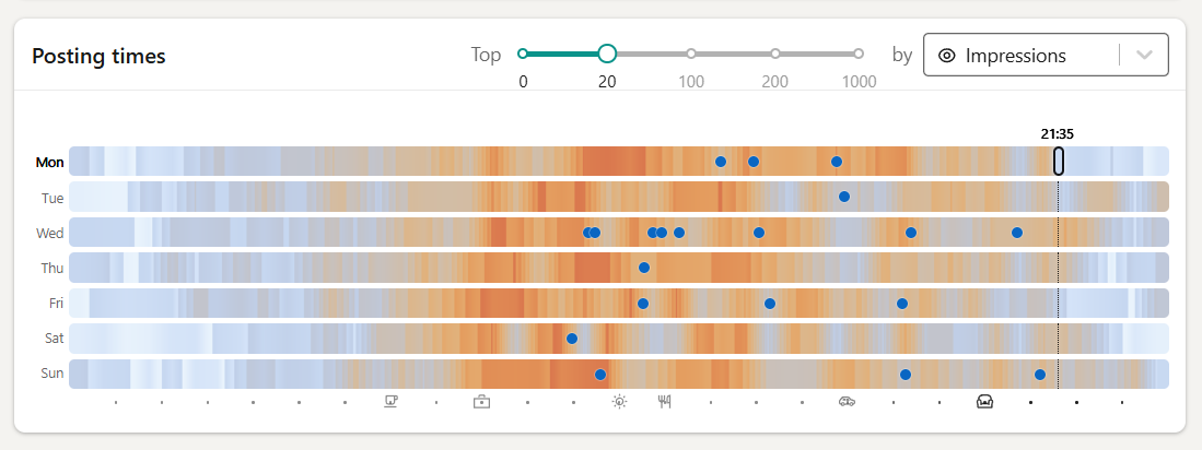 We will only show a certain number of top posts based on the selected dimension (eg. impressions, reaction count, comment count, etc.). Change how many posts are shown by adjusting the cut-off value. Set to 0 to see just the best times chart.